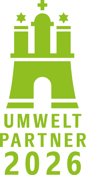 Auch 2026 setzen wir unser Engagement fort: Für unsere freiwilligen Leistungen über gesetzliche Anforderungen hinaus wurde uns erneut die Auszeichnung als UmweltPartner Hamburg verliehen.